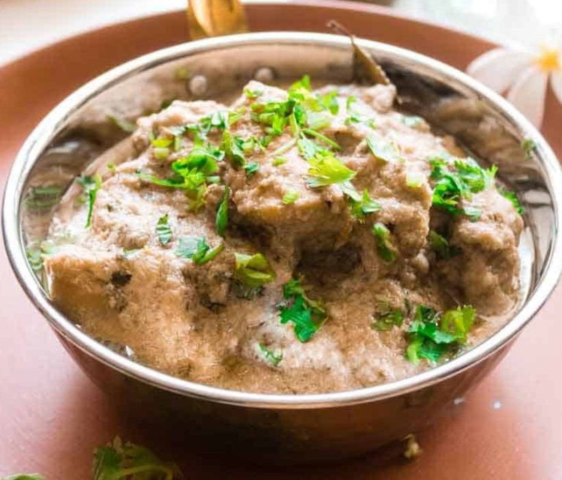 A delicious dish made with minced chicken, ginger, garlic, cilantro, red chili powder, turmeric and then steam cooked in a spicy curry.